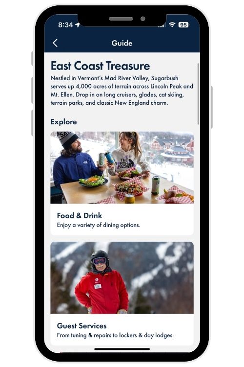 Whether you’re learning the ins and outs of Sugarbush or planning your next Ikon adventure, the Destination Guides in the app have you covered. Explore detailed destination pages with insider info on terrain, dining, parking, events and more — all curated for each resort.