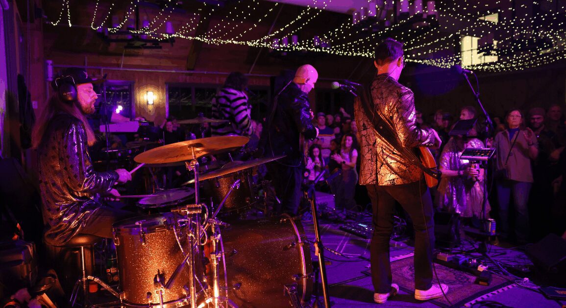 A band playing in front of blown up bubble letters that says The Big Kicker